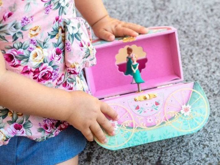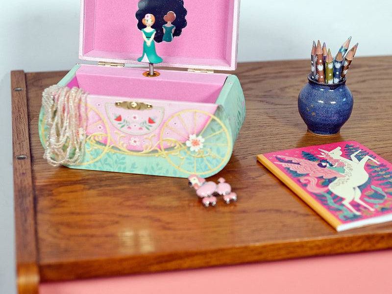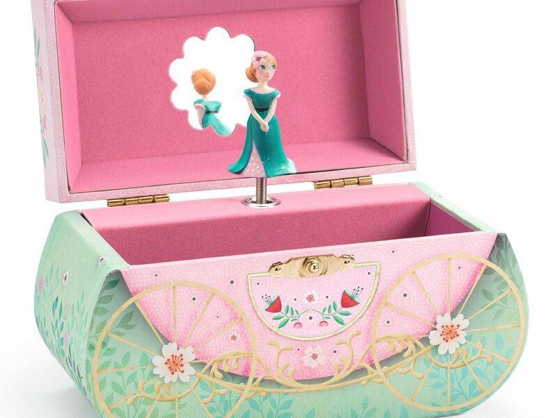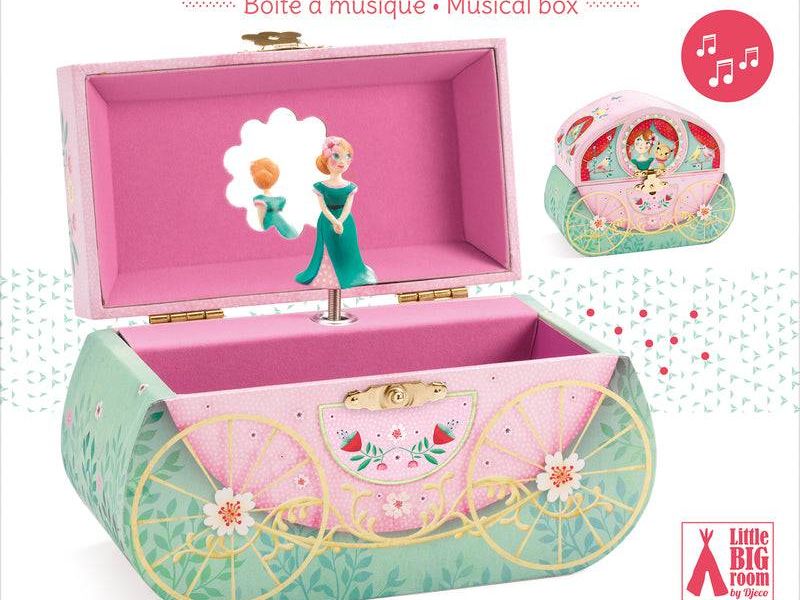 Elegant carriage shaped music box with princess and cat characters. Music featured is "Let Me Call You Sweetheart" A quality wood box that is sure to be treasured for years.
