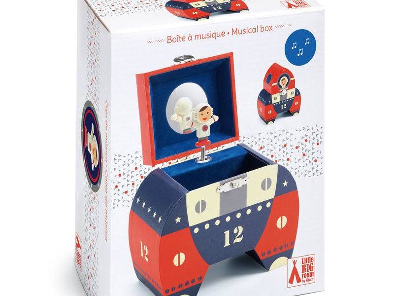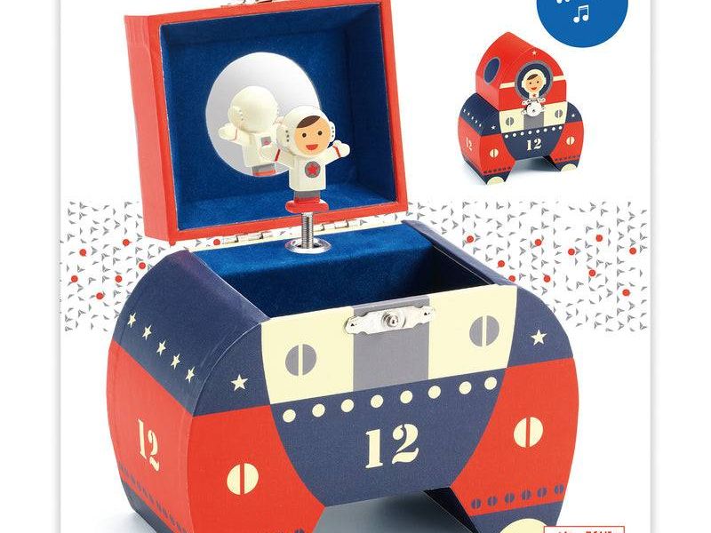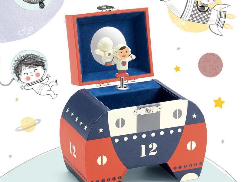 Ready for take off with this red, white and blue space ship with brave astronaut! Watch him spin in space.