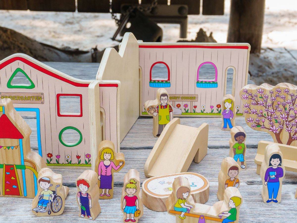 Finally a wooden set that combines creative play with classic kindergarten scenes your child will cherish. Featuring gardens, quiet corners, and play areas, this set inspires imaginative storytelling. A great tool to introduce your little one to the fun to be had a childcare or kinder.