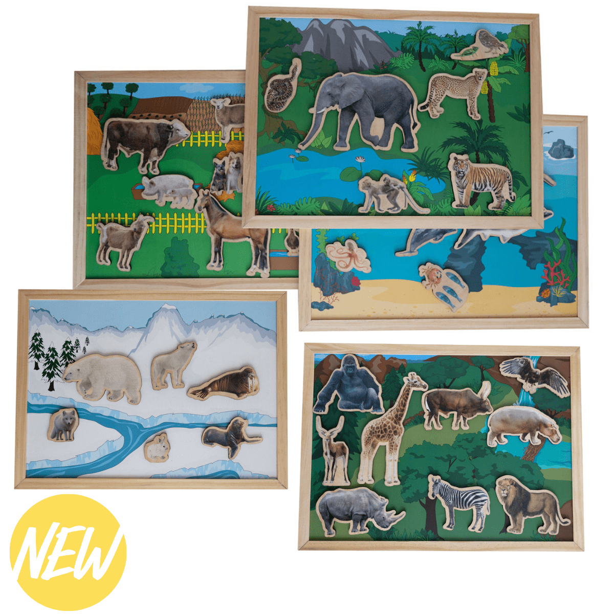 Featuring 5 beautifully illustrated, magnetic scenes in nature —Ocean, Jungle, Savanna, Arctic, and Farm—and 40 magnetic animal pieces, children can explore the natural world while building their understanding of ecosystems, animal types, and geography through hands-on play.