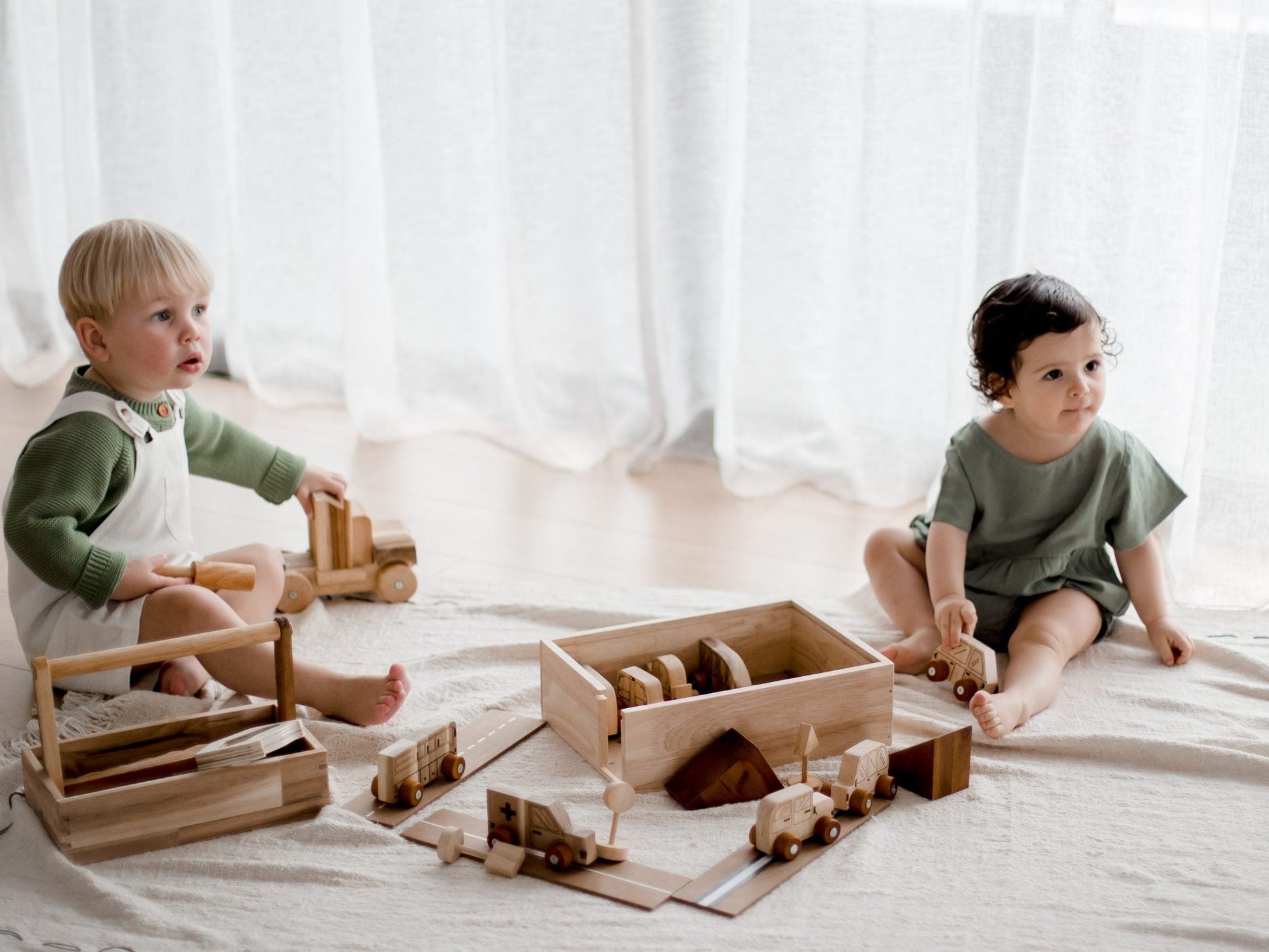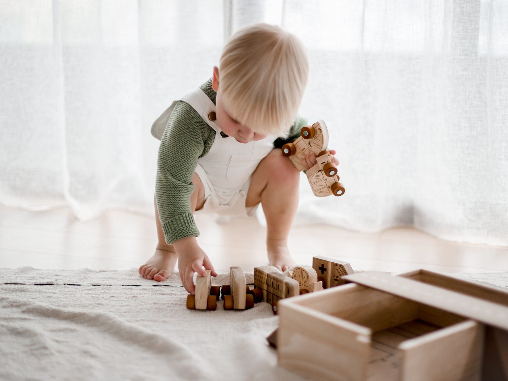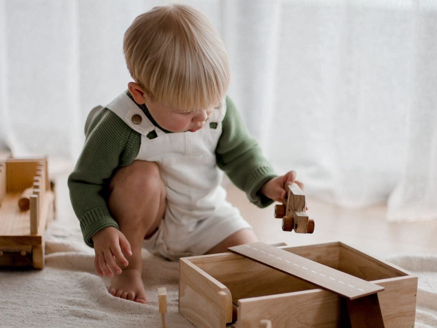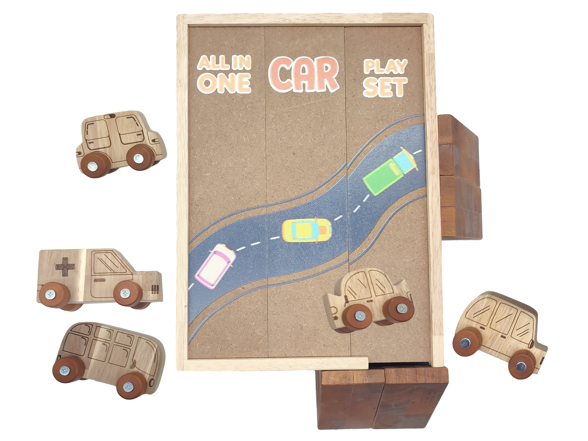 Our car play set is part of our new design. This set includes 9 vehicles, 3 roads, 4 blocks, 3 traffic signs and a reusable wooden box to store and play. This set is perfect for imaginative play.