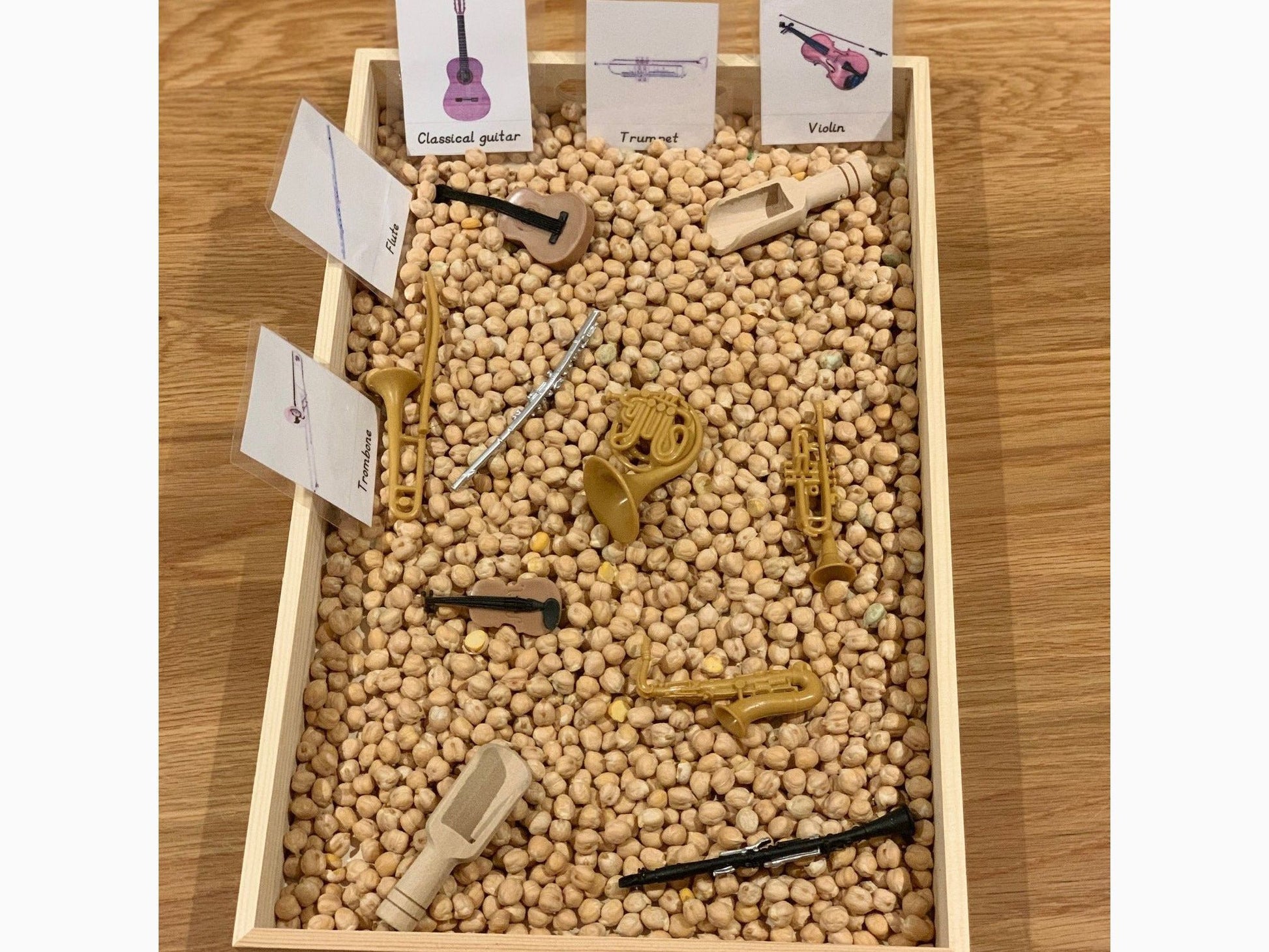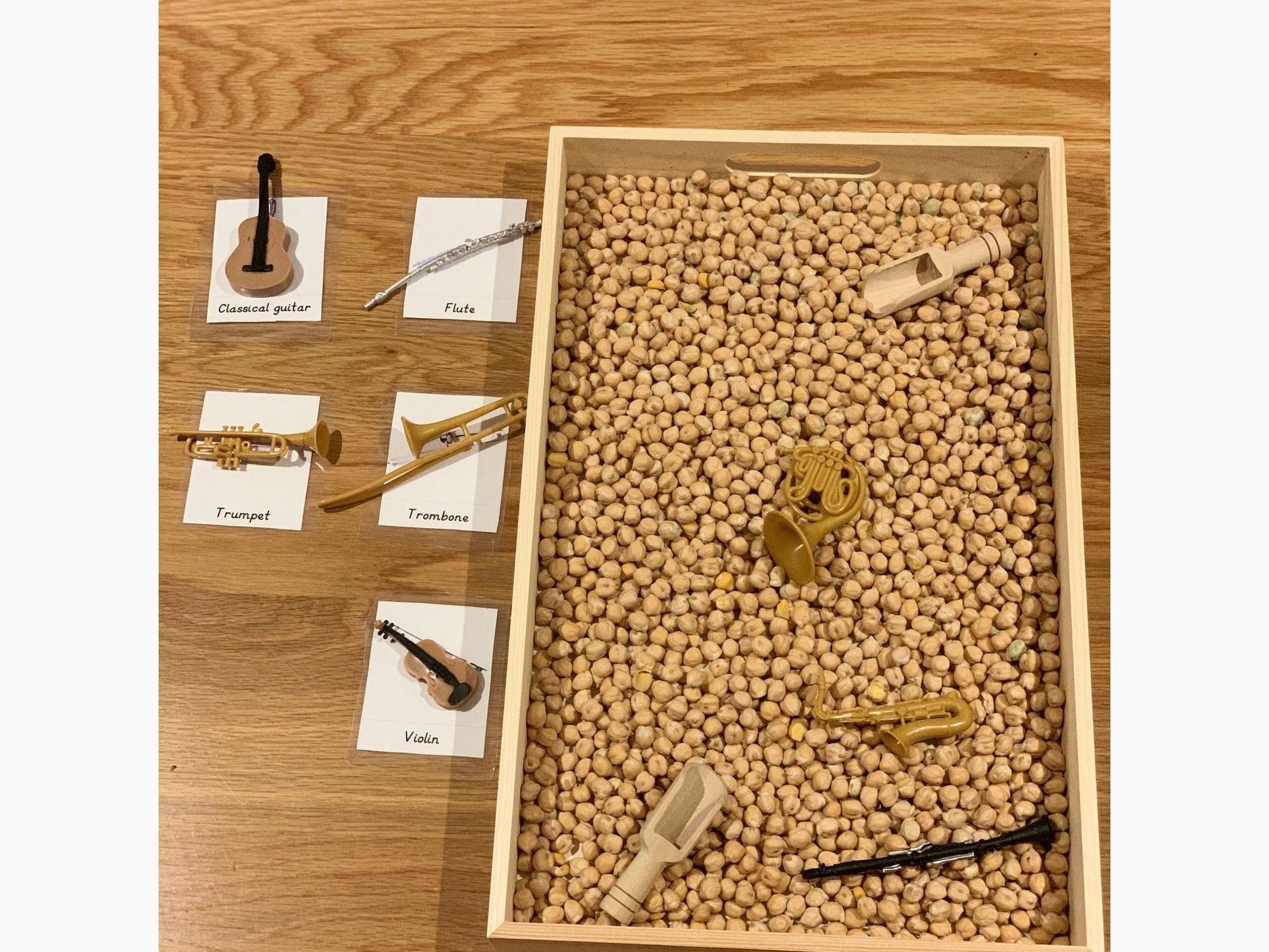 Miniature Instrument Collection with Interactive Language Flashcards MATCHING LANGUAGE CARDS TO DOWNLOAD Click here for DOWNLOADABLE PDF 8 pieces per TOOB®. Contents Cannot Be Purchased Individually. Start your own band with this wide arrangement of instruments! Including a trombone, flute, saxophone, classical guitar, violin, French horn, trumpet, and a clarinet, our Musical Instruments Toob has everything needed to sell out concert halls – after you practice a bit first! Characteristics: Artfully crafted and beautifully hand painted, these figurines capture all the intricate features of each instrument for true to life detail. Take the lead solo with the trombone or just keep the rhythm while strumming the guitar – however you decide to use these models is up to you! Size and Color: This Toob measure 1.5 inches long, 1.5 inches wide, and 12.8 inches tall, making it a touch larger than a standard American ruler. It contains 8 figurines that range from 1.25 to 3.75 inches tall, including a perfectly polished golden brass French horn and a beautifully pale tan violin made from maple wood. The Musical Instruments TOOB® is part of the TOOBS® collection. All of our products are Non-toxic and BPA free. History: Did you know that musical instruments have been around for thousands of years? In fact, a more simplified version of the flute was one of the earliest instruments created, dating back to almost 70,000 years ago. While there are many different ways to organize instruments during a concert, such as by their range, material composition, size, and so on, we suggest you forget about all the technicalities and just have fun composing masterpieces with whatever sounds you want! Recommended Age: 3+. The Mini Musicians TOOB® Contains: