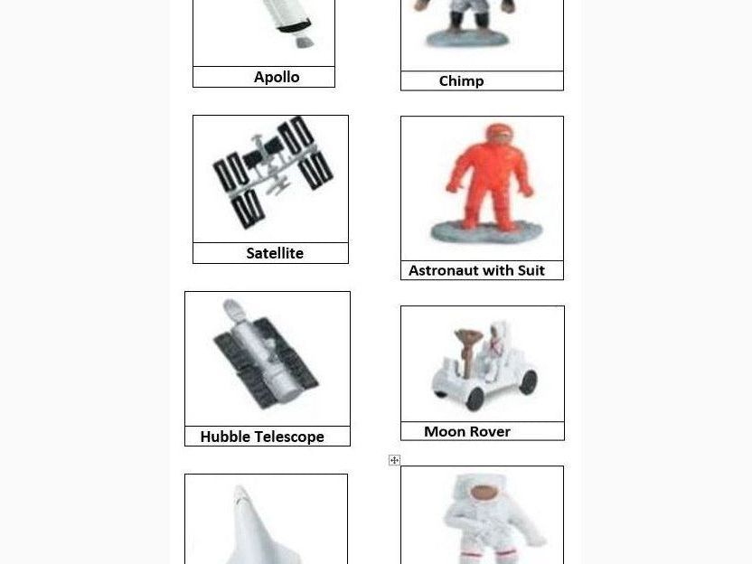 - Take to the stars with this Safari Space Toob! This set includes 2 astronauts, Private Ham (the First Space Chimp), Saturn V Rocket, Gemini Capsule, Apollo Spacecraft, Lunar Rover, a Space Shuttle, Hubble Space Telescope, and satellite.